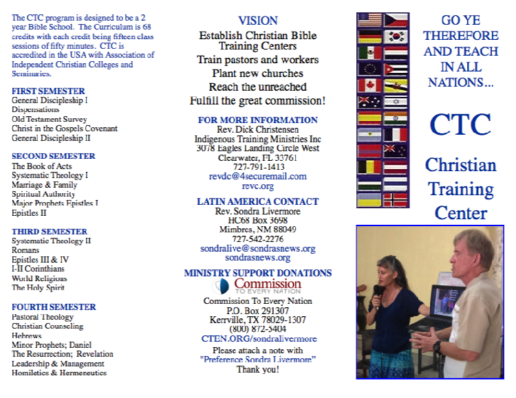Sondra's main focus with ITM is to establish contact with Christian pastors, organizations or denominations in Latin America that are interested in running a Bible College.  She has made many scouting trips in the last three years. The Christian Training Center(CTC) program offers two years of Bible College curriculum at no cost.  Once the CTC is established, leadership receives training program and complete responsibility.  The CTC belongs to them.  Sondra is involved in overseeing the CTC from a distance, visits frequently to teach, pray and encourage.