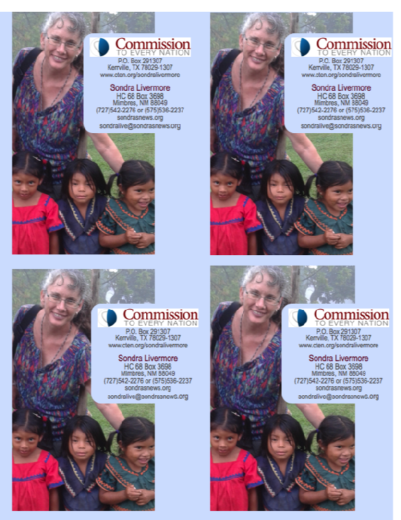 Sondra is working in Central & South America as a full time missionary with Commission to Every Nation (CTEN). Sondra is raising funds to help Latin pastors with outreach projects and ministry to their communities. She also partners with Indigenous Training Ministries (ITM) establishing and maintaining Christian Training Centers (CTCs) with the purpose of educating pastors and leadership.